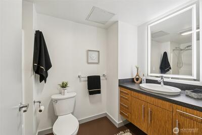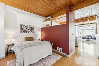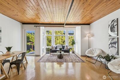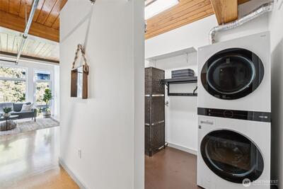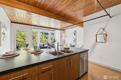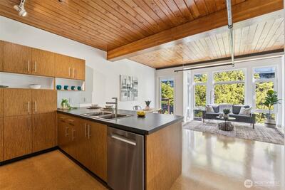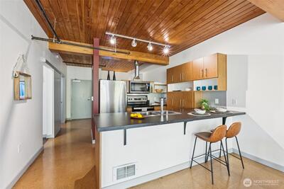 Welcome to the best of South Lake Union living in this impressive corner unit at Veer Lofts. Coveted secure parking, private storage, and community amenities like a pet wash and BBQ courtyard, all within walking distance to everything you want in the city! This unit features soaring ceilings, a wall of floor to ceiling windows, a private balcony and an open-concept design that extends the modern living space; ideal for everyday comfort. The sleek kitchen, featuring newer stainless steel appliances seamlessly connects to the living and dining areas. Beautiful full-sized washer and dryer convey.