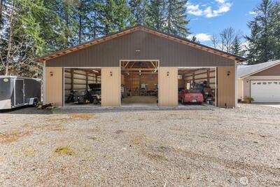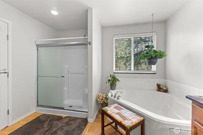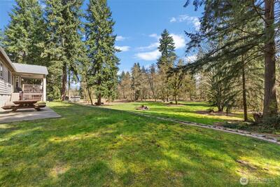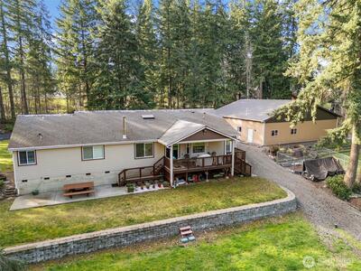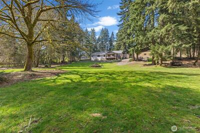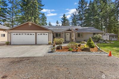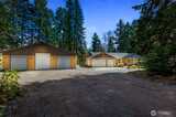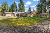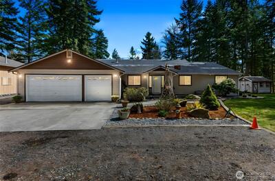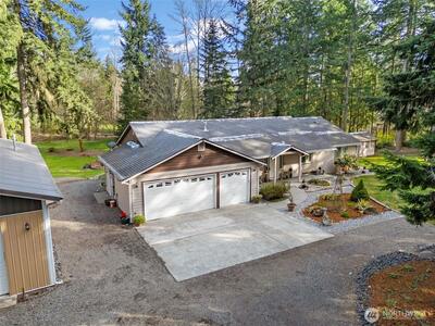 Beautiful Bonney Lake rambler on 5 fully fenced acres welcomes you with a charming covered front porch and warm hardwood entry. Spacious great room showcases vaulted ceilings, abundant natural light, and a cozy wood-burning stove—perfect for everyday living and entertaining. Open-concept kitchen features updated kitchen with granite countertops, stainless steel appliances, center island, recessed lighting, and a generous pantry, flowing seamlessly into the bright dining area. Versatile layout offers a den/office just off the entry—ideal for working from home—plus a large bonus room off the dining area that can serve as a media room, playroom, or additional living space. The spacious primary suite is a true retreat with a 5-piece bath, including soaking tub, double vanity, and walk-in closet. Additional bedrooms are well-sized and thoughtfully positioned for comfort and privacy. Enjoy year-round outdoor living with covered decks overlooking the expansive property—perfect for rel