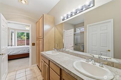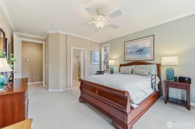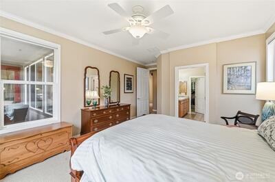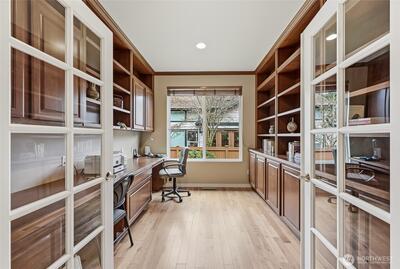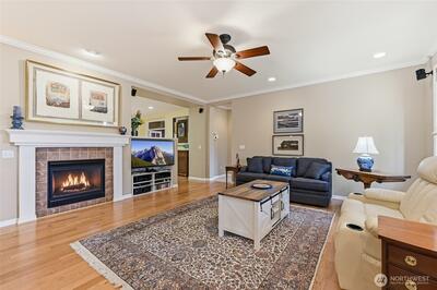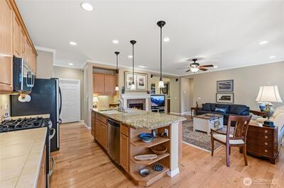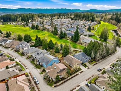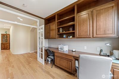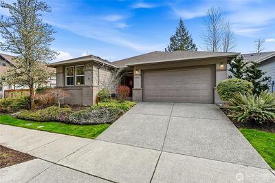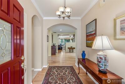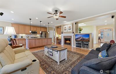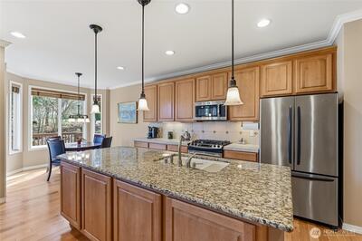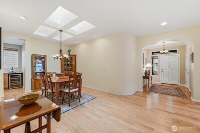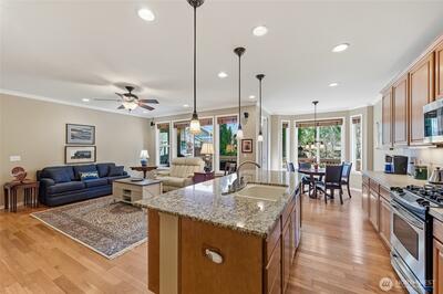 Captivating greenspace views that expand out to the golf course from this beautiful Bainbridge home. Enjoy easy living in this one level home with a peaceful & private setting just a couple of level blocks to the clubhouse. Warm hardwood floors run through the main living areas and there are distinctive architectural design elements such as crown molding, the curved wall and four panel skylight. The great room works perfectly for today’s lifestyles & has a surround sound system that includes a Denon amplifier and Sony speakers. The dining room seats 12 and is a wonderful space for holiday and special occasions dinners. Island kitchen with extra cabinets + pull-out shelves, wine fridge and a convenient day desk. Handsome office with gorgeous wood bookcases, cabinets, desk spaces and glass doors. Primary bedroom w/a ¾ bath, linen cabinet & walk-in closet w/organizers. Guest bedroom & full bath. Brand new W/D plus a utility sink in the laundry room. Generous garage w/work bench and she