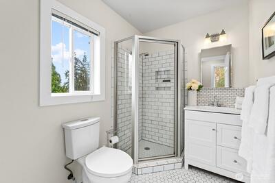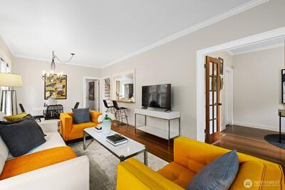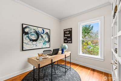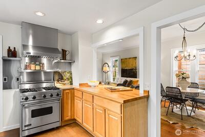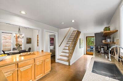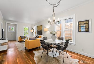 Sweet south facing 1904 Craftsman in the lovely Arboretum neighborhood of East Capitol Hill. This 3 bedroom, 1.75 bath home has been wonderfully updated with modern conveniences. You'll love the chef's kitchen with a commercial Viking gas range, quartz counters, a hardwood prep counter, ceramic tile backsplash, and cork floors. The main level includes two bedrooms, a full bathroom with a claw-foot tub, the kitchen, laundry area, and a door to the rear deck and yard. Beautiful fir floors throughout most of the main level. The primary suite, with a 3/4 bathroom, is upstairs. The second bedroom on the main floor can also be used as a home office - it has built in book shelves and no closet. Storage space in the small basement. A spacious rear yard is quite level with plenty of room for a garden and/or play space. The large deck is ideal for outdoor meals and entertaining. One off-street parking space. Newer roof (2021) and furnace (2022). Fantastic walking neighborhood - steps to shops,