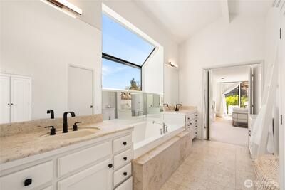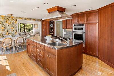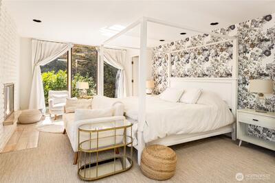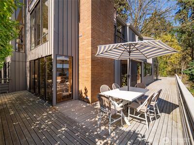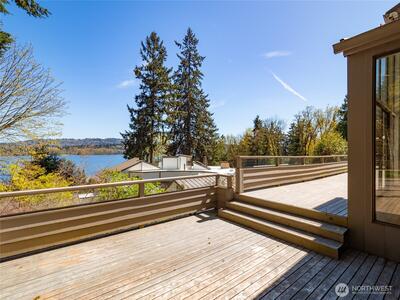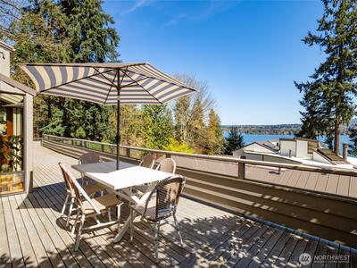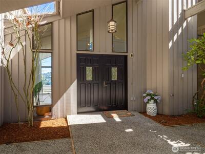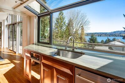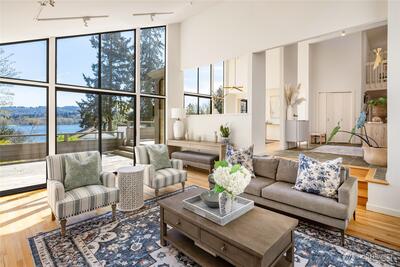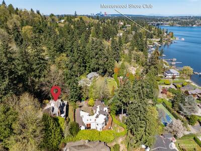Perched on the coveted eastern shore of Mercer Island, this contemporary masterpiece offers a rare blend of architectural brilliance and Pacific Northwest serenity. Designed to capture the essence of lakeside living, the home boasts unobstructed, panoramic views of Lake Washington and the majestic Cascade Mountains. Every morning, wake up to stunning sunrises that paint the sky in hues of gold and violet, visible through expansive floor-to-ceiling windows that blur the line between indoors and out. The thoughtful floor plan spans 5 spacious bedrooms and 4 designer bathrooms offering ample space for both quiet retreats and grand-scale entertaining. The heart of the home is a chef-inspired kitchen, and the enormous room over the garage is perfect for your home office with stunning views. Step outside to find a rare island treasure: a decent sized flat lawn area—ideal for summer garden parties, morning yoga, or kicking a soccer ball around. Situated just south of the prestigious Mercerw