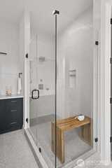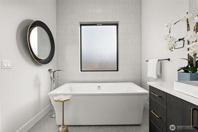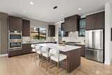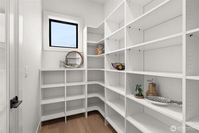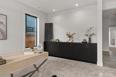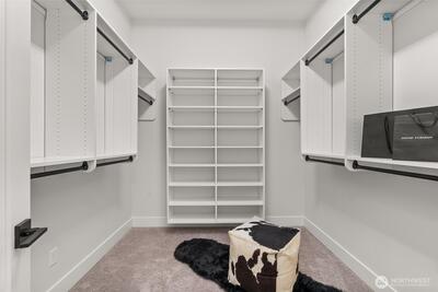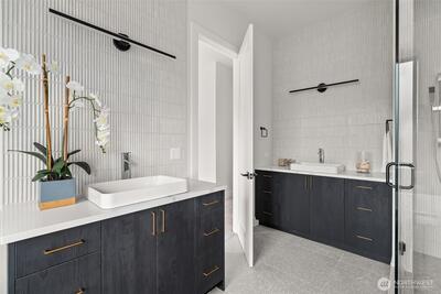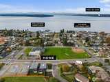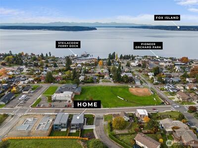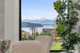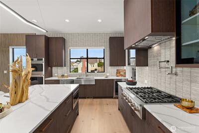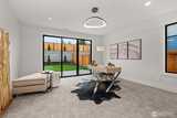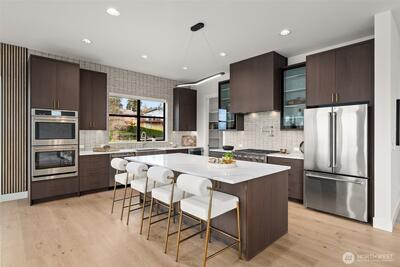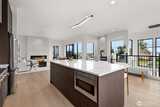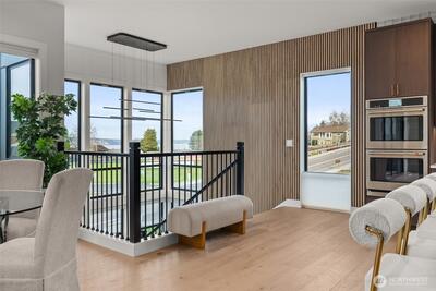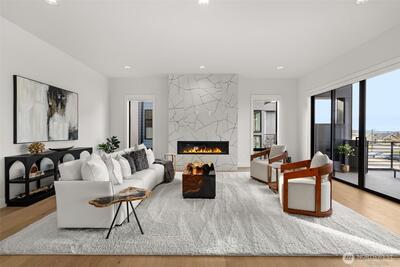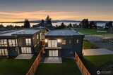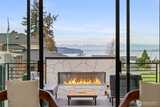 Experience unforgettable sunsets and Puget Sound views from this exceptional home, perfectly positioned on a premium corner lot. A grand two-story entry welcomes you with striking accent walls and dramatic floor-to-ceiling black-framed windows that fill the home with natural light. The chef’s kitchen is a true centerpiece, featuring custom cabinetry, quartz countertops, full-height backsplash, stainless steel appliances, double ovens, and a huge walk-in pantry. The open-concept layout flows seamlessly into the formal dining area and great room, highlighted by a floor-to-ceiling tile surround linear gas fireplace. Enjoy effortless indoor-outdoor living with a large wall slider opening to a covered outdoor space complete with its own linear gas fireplace—perfect for year-round entertaining. The main level primary suite offers a peaceful retreat with a generous walk-in closet and a luxurious five piece ensuite featuring a freestanding soaking tub and tiled walk-in shower. A private gu