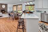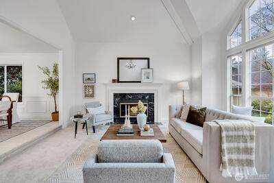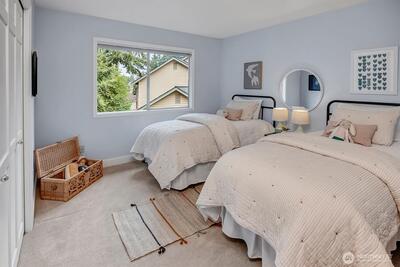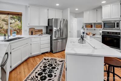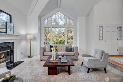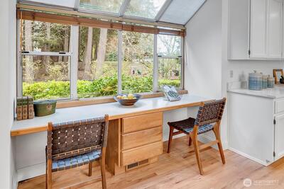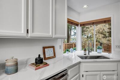 Thoughtfully updated Sammamish home tucked on a quiet cul-de-sac, offering 4 bedrooms plus a main floor office and 2.5 baths. A vaulted entry welcomes you in with a sense of space and light, while hardwood floors carry through the entry, kitchen, and great room. The kitchen features custom quartz counters and a built-in desk—perfect for homework, study, or everyday organization—and opens naturally to the surrounding living spaces with easy connection to the backyard, creating a comfortable flow for both daily life and gatherings. Two gas fireplaces add warmth and flexibility throughout. Fresh interior paint and new carpet provide a crisp, move-in ready feel. Upstairs, the primary suite is light-filled with a skylight and includes a 5-piece bath and walk-in closet for a comfortable, functional retreat. Additional bedrooms are generously sized. Set on a 7,567 sq ft lot, a true gardener's delight with beautiful trees and year round blooms as your backdrop, offering privacy and a peace