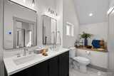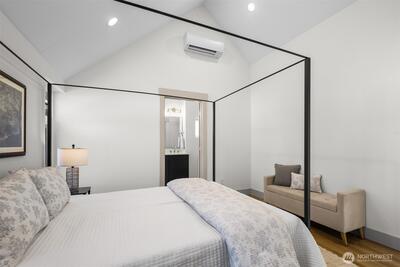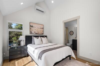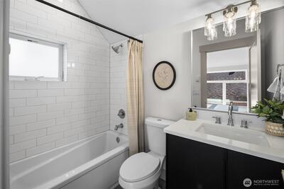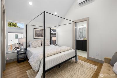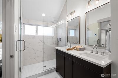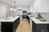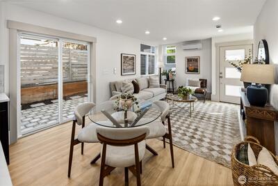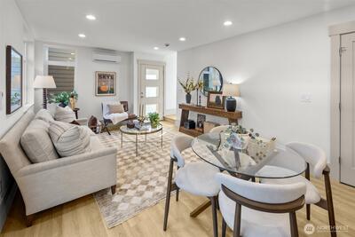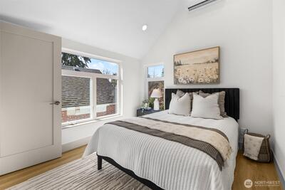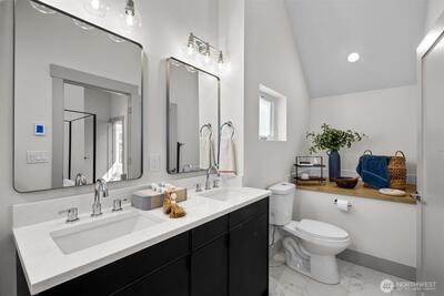Quality construction meets intentional design in this brand-new stand-alone cottage by Accessory Dwellings, nestled in the highly desirable Belvidere neighborhood of West Seattle. The open-concept main floor delivers from the moment you walk in, with flat-panel cabinetry, a clean-lined island with quartz counters, stainless appliances, and warm luxury vinyl plank floors throughout. A powder room off the kitchen and sliding door to a private yard add seamless convenience. Upstairs, both bedrooms enjoy their own ensuite bathrooms. The primary suite features a walk-in closet and a spa-worthy bath with dual sinks, quartz counters, and a frameless glass shower. Radiant heated floors in the primary bath add a welcome touch of luxury. The spacious secondary bedroom is equally well-appointed with its own private bath. Dedicated off-street EV-ready parking completes the package. The location is a genuine West Seattle gem. Lady Jaye, Little Donkey, and the beloved Met Market are all just minutes