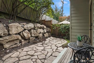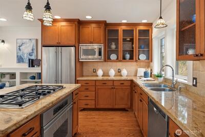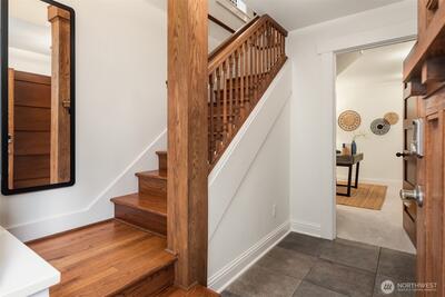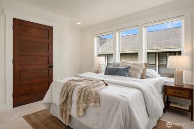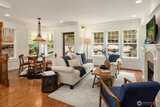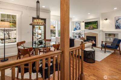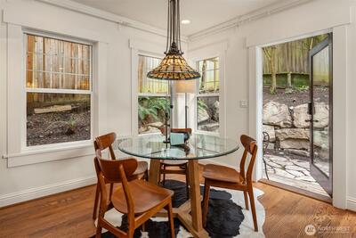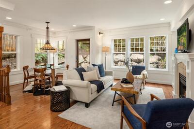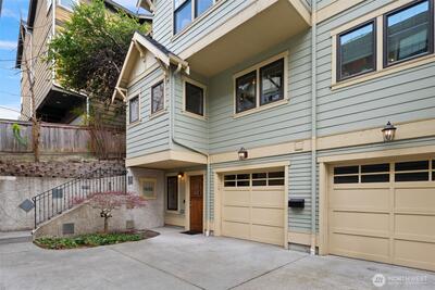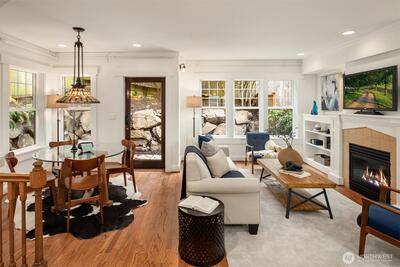 Impeccably crafted end-unit Craftsman townhome by Avalon NW in Wallingford, walking distance to both Wallingford and Fremont. Extensive woodwork and molding throughout, solid hardwood doors, custom light fixtures, and hardwood floors across the main living level. Chef's kitchen with full appliance suite opens to living and dining space, flowing out to a private fenced backyard with stone patio, rare indoor-outdoor living for a Seattle townhome. Upper-level primary suite with vaulted ceilings, skylights, fireplace, and en-suite bath featuring Italian-tiled shower and heated floors. Entry level offers flexible den/office plus oversized attached garage. Two fireplaces, high-tech cabling, and thoughtful finishes top to bottom. Corner lot end-unit layout provides extra natural light and privacy. Steps to the Burke-Gilman Trail, Fremont Brewing, Paseo, PCC, and the Fremont Sunday Market. Wallingford cafes and restaurants along N 45th also within easy reach. Woodland Park Zoo, Gas Works Park,