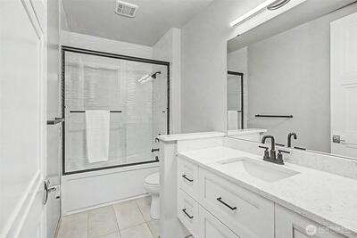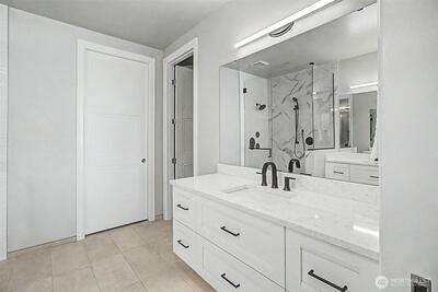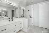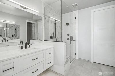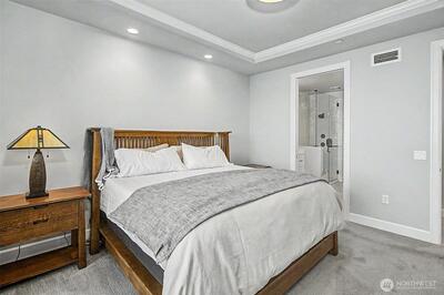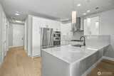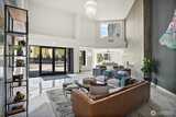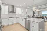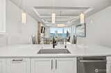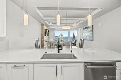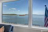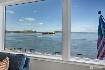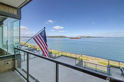 Experience elevated waterfront living in this exceptional 6th-floor condominium at Point Ruston, where sweeping views of Commencement Bay and Vashon Island unfold alongside passing marine traffic, a subtle glimpse of Mt Rainier, and the shifting glow of evening light across the water. From this vantage point, the home captures both the energy of the waterfront and a sense of privacy and calm. Clean lines, simplicity, and quality offer understated luxury throughout. The open-concept layout connects the kitchen, dining, and living areas in a way that is both functional and inviting, creating an easy flow for daily living and entertaining. In the kitchen, prepare meals on quartz waterfall-edge countertops while enjoying Bosch stainless steel appliances, custom cabinetry, and Moen fixtures. Wide-plank flooring and chic lighting establish a cohesive, modern feel and Hunter Douglas shutters and motorized blinds let you tailor light and privacy throughout the day. The primary suite is a peace