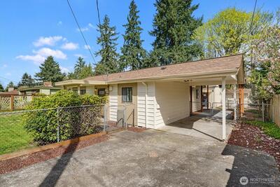 Welcome to this wonderful rambler on a quiet dead end street in SeaTac! This fully fenced property has dual gates providing access to tons of parking, with even more off street parking available out front. The large, beautiful side yard leads to the oversized carport and incredible garage/shop, with all the custom diamond plate built-in cabinetry, storage and shelving staying with the home! The spacious kitchen has room for a breakfast table, a moveable island for convenience, and a garden window overlooking the front yard, and the large, conveniently located utility room can double as a pantry. Both bedrooms and the living room have their own ceiling flush mounted mini splits for comfortable heating and A/C. The bathroom features tile flooring and a beautiful tile walk-in shower plus access to one of the bedrooms. Fresh interior paint throughout and brand new carpet in the bedrooms as well. Cute patio off the back door with ceiling fan and bench for outdoor relaxing. Fantastic
