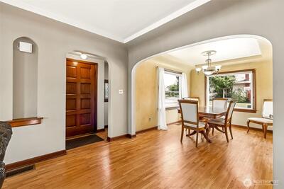 First time on the market in 76 years, this early Tacoma home sits along the historic route connecting downtown to “Galloping Gertie,” the original Tacoma Narrows Bridge. A great opportunity to own one of the neighborhood’s earliest residences. Neighborhood lore even suggests that mules helped dig the home’s basement—one of many reminders of its early Tacoma roots. Craftsman-era charm shines throughout with a welcoming entry vestibule with leaded glass sidelights, wood floors, Craftsman doors, coved ceilings, and a formal dining room. The beautifully updated kitchen features Ericksons custom cabinetry, stylish tile, a garden window, and a cozy breakfast nook. A permitted 12×14 solarium adds a bright and relaxing space to enjoy year-round. The 952 sq ft basement with 8-ft ceilings offers excellent storage and future equity. Major updates over the years include windows, plumbing, roof & gutters, siding, chimney, insulation, a 92% efficiency gas furnace, gas water heater, gas