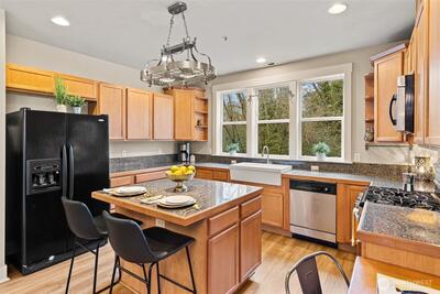 Welcome to this beautiful home located in the Foster area of Tukwila. This home is positioned to offer fantastic privacy! Sitting up at the end of a road, it feels like a private oasis. The Main Level offers a grand entryway with tall ceilings. The comfortable, open concept floor plan has a peaceful feeling as you look out to the trees through the large windows in the Kitchen, which has wonderful counter space, including an island. There is a formal Dining Room and a Living Room with a gas fireplace and built-in bookshelves. The Living Room opens to a new deck through the French doors. There is also an office on the Main Level. Upstairs is the spacious Primary Suite, featuring vaulted ceilings, walk-in closets, and a luxurious Primary Bathroom. 2 other good-sized bedrooms, a laundry room, and a full Bathroom are also on the second floor. The lower level has the fourth bedroom, a Rec Room, a full Bath, and a second Laundry/Utility room with a large sink and a butcher block counter. This