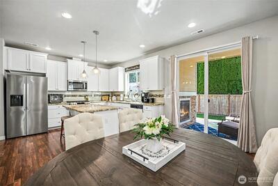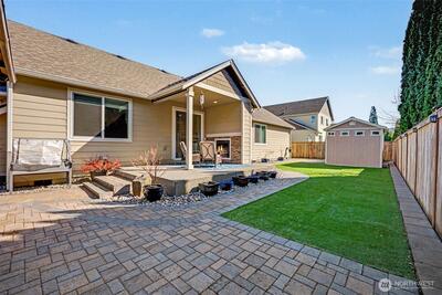 Incredibly rare find! Beautifully maintained Sumner rambler built in 2018, offering thoughtful upgrades and modern comfort throughout, on a culdesac street. This 3-bedroom home features a welcoming covered front porch and an open layout that moves seamlessly into a covered back patio complete with an outdoor gas fireplace, ideal for year-round enjoyment and entertaining. The open-concept great room is filled with natural light, creating a warm and inviting living space with a gas fireplace. A well-designed layout includes ample storage, generously sized bedrooms, and a primary suite with a walk-in closet and private bath. Additional features include a heated 3-car garage with tall ceilings for added storage flexibility, versatile 30amp and 40amp outlets suitable for electric vehicle charging or shop use, and a tankless water heater. The fully fenced, level backyard includes a beautifully hand-laid brick pathway and a low maintenance turf lawn, along with a large storage shed for tools
