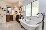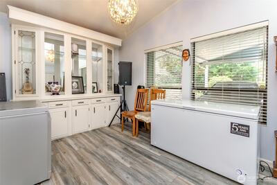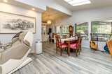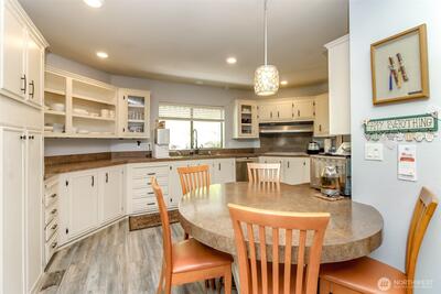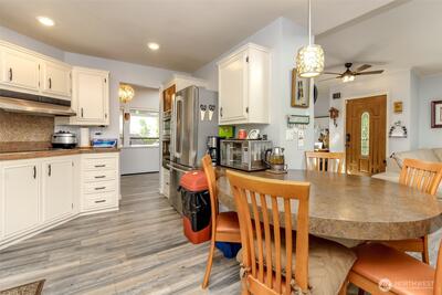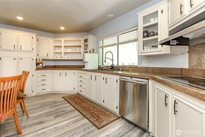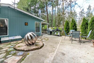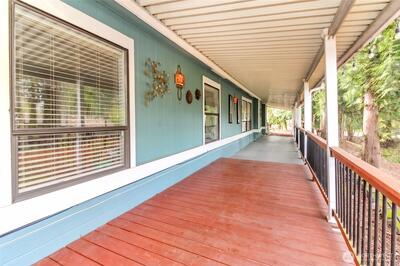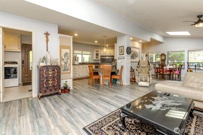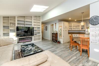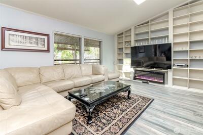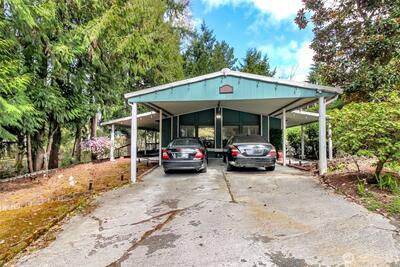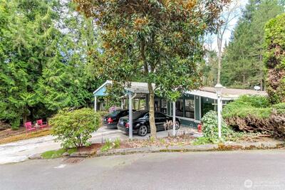 Nestled in the desirable Kloshe Illahee community, this beautifully maintained manufactured home offers a serene retreat with peaceful creek views on a semi-secluded lot. Vaulted ceilings and skylights fill the spacious living and dining areas with abundant natural light, creating an open and airy ambiance. Custom built-ins in the living room add both charm and functional storage. The generous kitchen features crisp white cabinetry, stainless steel appliances, and a peninsula with additional seating. A utility room with extra storage leads to a convenient ¾ bath with a walk-in shower. The primary suite is a true haven, showcasing expansive windows, a walk-in closet, and a luxurious en-suite bath complete with double vanities, a walk-in shower, and a large soaking tub. Enjoy outdoor living on the expansive back patio or covered side deck. A two-car carport and extended driveway provide ample parking. Residents of Kloshe Illahee enjoy exceptional amenities, including a clubhouse wit