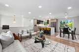 Tucked at the end of a quiet cul-de-sac and backing to a serene park, this beautifully updated split-level home offers modern living with privacy and natural light. Set on a manicured, sun-filled quarter-acre lot with mature trees, the setting is both open and secluded. Inside, enjoy a fully remodeled interior with contemporary finishes throughout. The stunning kitchen features a slab quartz waterfall island, custom cabinetry, under-cabinet lighting, and pop-up charging stations. Wide-plank LVP flooring and tile run throughout—no carpet. The open main level is anchored by a striking gas fireplace and modern lighting. The primary suite offers a spa-like bath with a freestanding soaking tub and a large walk-in shower. The lower level includes two bedrooms, a spacious rec room with a wood-burning fireplace, and a finished laundry room. Recent updates include a new tankless water heater, new windows, and fresh interior and exterior painting. Outdoors, enjoy a landscaped ya