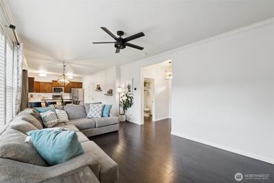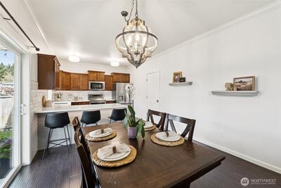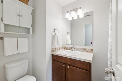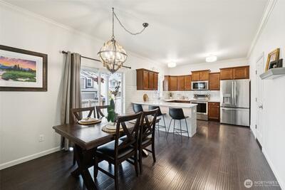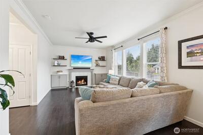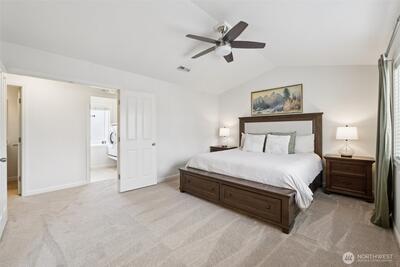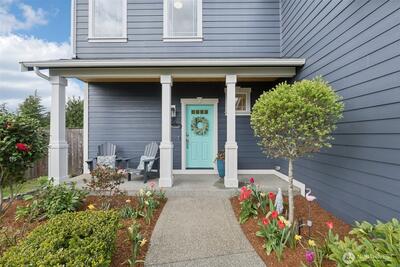 Welcome to Modern Elegance in the highly desirable Rainier Gem community. This well maintained 4 bedroom, 2.5 bathroom home by Rush Residential sits at the end of a quiet cul de sac in Puyallup, showcasing quality craftsmanship and thoughtful design. Inside, an open concept floor plan features white painted millwork and designer finishes throughout. Recent upgrades include new carpet, fresh interior paint, a new hot water tank, and new flooring in the primary bathroom. The gourmet kitchen offers quartz countertops, a full height tile backsplash, and stainless steel appliances, with the stove, microwave, and dishwasher all recently updated. It opens seamlessly to a light filled great room, ideal for entertaining or relaxing. The primary suite features vaulted ceilings and a spa inspired five piece bath with soaking tub, dual vanities, and a walk in closet. Three additional bedrooms provide flexible space for guests, office, or fitness. Enjoy a fully fenced, landscaped backyard with pati