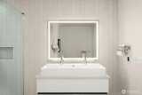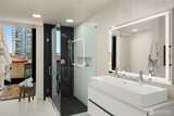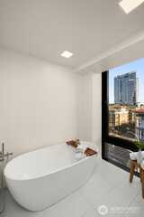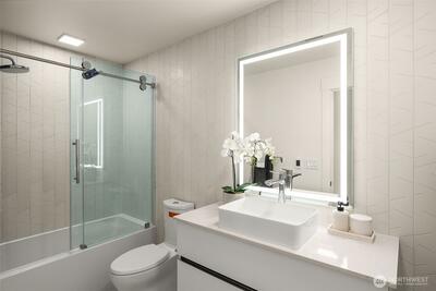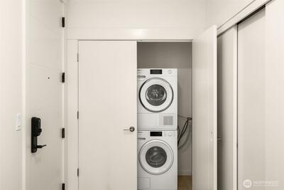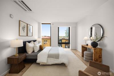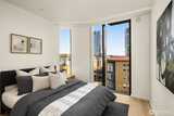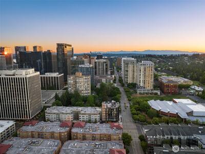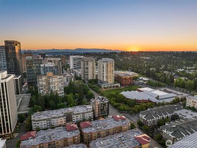 Discover luxury at GIS Plaza in downtown Bellevue. This innovative development redefines urban living with cutting-edge design and unparalleled elegance. This 5th-floor two-bedroom boasts lofty ceilings, engineered hardwood floors, operable windows, and A/C for optimal comfort. Flow into the open-concept modern kitchen that showcases state-of-the-art Miele appliances, quartz countertops, and sleek finishes. The generously sized bathrooms is adorned with Grohe fixtures, ceramic tile, and luxurious heated floors. GIS includes a futuristic mechanical auto valet garage and a vast rooftop deck to take in the views. Conveniently situated adjacent to the Bellevue library, the playfield, and the endless amenities of downtown Bellevue!