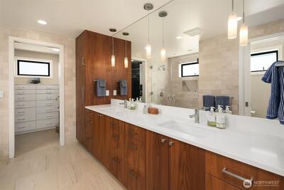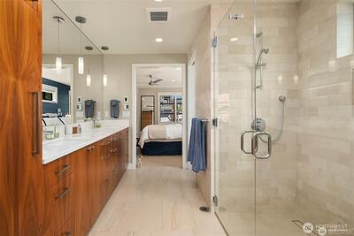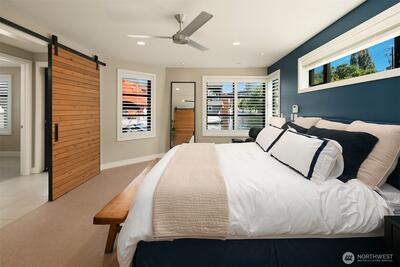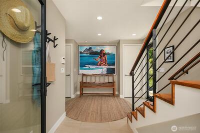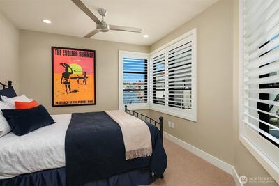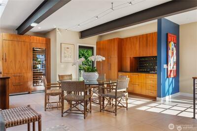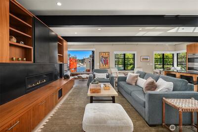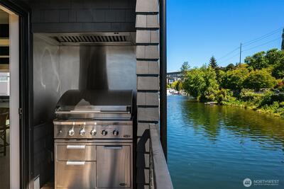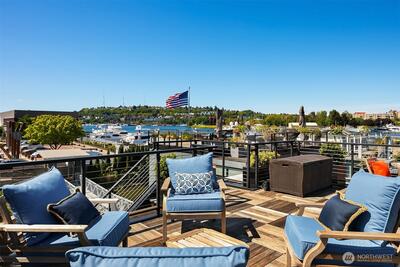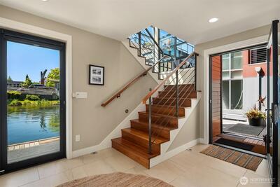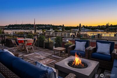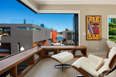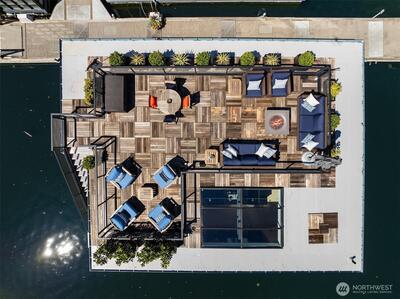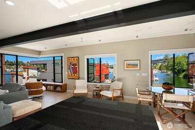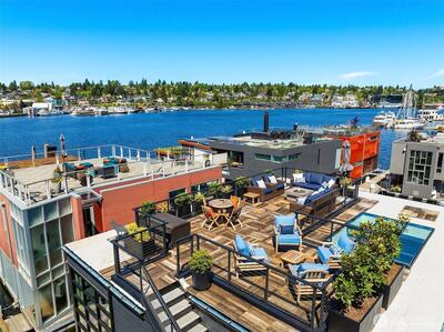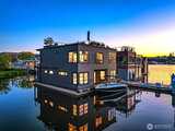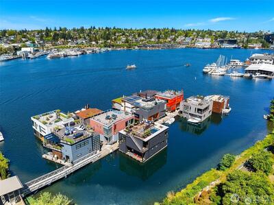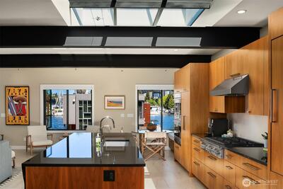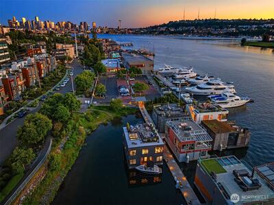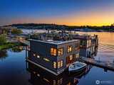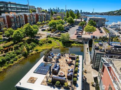 Stunning gated residence in the boutique, 12 slip community of Wards Cove. State of the art design built by Dyna Construction in 2015 with 30ft steel beams. Second floor Great Room with Chef's skylit kitchen, top of the line appliances include a Sub Zero refrigerator, built-in wine refrigerator, under counter fridge & freezer drawers, a Miele dishwasher & Wolf gas range. Custom Walnut cabinetry throughout, cold rolled steel fireplace & corner nano-window reading nook. The main floor offers 3 bedrooms (spacious primary suite with one of the largest walk in closets I have seen on a floating home), laundry & storage. Moorage for up to 25ft boat. Roof deck with views of Lake Union, 4th of July fireworks & glorious sunsets. Huge, 1200sf basement with tons of storage has 5ft+(approx) ceiling height. There are also 2 large exterior storage rooms for bikes and gear. Automated blinds & Lutron lighting. Radiant heated tile floors keep you warm all year & AC cools for summer. Brand new roof in