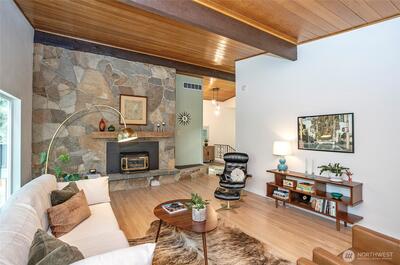 Expansive and thoughtfully curated midcentury ranch, originally built in 1962, blending timeless character with modern updates. A level entry opens to a stone foyer and a striking great room with vaulted beamed ceilings and a dramatic slate fireplace. Brand new double paned windows fill the home with natural light, highlighting new hardwood floors and a design approach that honors midcentury modern style with clean lines and a desirable aesthetic. The updated kitchen features quartz countertops, stainless appliances, and refined finishes that complement the home’s architectural roots. Four spacious bedrooms retain original millwork, built-in closets, and endless charm. Bathrooms have been refreshed with a cohesive, modern touch. Outdoor living shines with west facing elevated decks ideal for relaxed entertaining, surrounded by extensive landscaping & fencing improvements that enhance privacy and curb appeal. The daylight lower level offers a large rec room with fireplace and ge