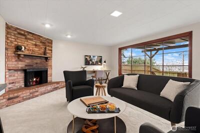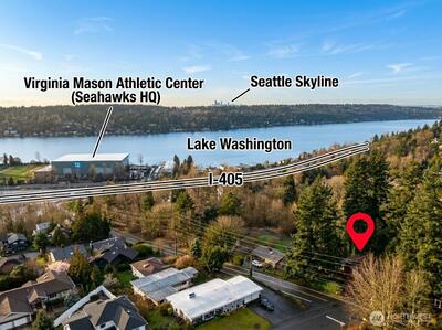 Stunning Views of Lake Washington from this ideally located property, in close proximity to I-405, I-90, Sea-Tac Airport and Downtown Bellevue. Perfectly perched, this unique property in a natural setting, feels private. Warm wood interiors create timeless charm and a welcoming nature retreat. The great room, full of ambiance with vaulted ceiling, wood-burning fireplace, and large sliding door providing access to expansive view deck. Kitchen with new appliances offers a picture window with tranquil water views. Main floor provides two bedrooms with warm log walls and a remodeled ¾ bath. Downstairs boast a cozy family room with fireplace and plush new carpet, patio and backyard access, two additional bedrooms, updated full bath, bonus room, and laundry.