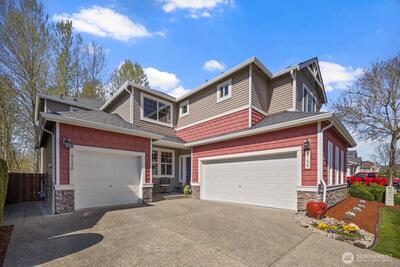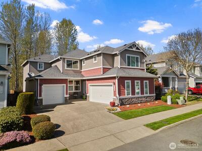 Experience the perfect blend of elegance and tranquility in this light-filled 5-bedroom Craftsman, nestled in the sought-after Creekside on Riverview community. The home’s centerpiece is a custom-designed chef’s kitchen, anchored by a commercial-grade 6-burner gas range and professional hood, complemented by rich cherrywood cabinetry, slab granite counters, and upscale stainless appliances. Designed for modern versatility, the main level features a secluded bedroom and adjacent three-quarter bath, offering an ideal setup for a long-term guest suite, private home office, or accessible main-floor living. The upper level is highlighted by an expansive Primary Suite with a spacious walk-in closet and generous 5-piece bath, plus three additional bedrooms, a full bath, and a convenient laundry room. The open-concept Great Room flows seamlessly to a private, level backyard where a brick-paved patio overlooks a lush, quiet greenbelt. Parking is effortless with separate 2-car and 1-car gara
