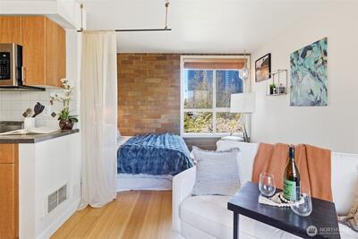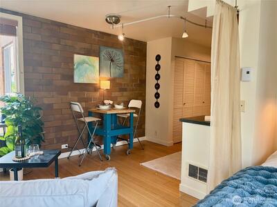 Whether you’re searching for a special place where you can paint or draw, or write a novel; or looking for a city home while you finish law school at Seattle University or do your residency at Harborview – we’ve got you covered! Right in the center of First Hill at 9th and Cherry, you can walk to everything you need and keep your compact light-filled studio as a private retreat. Owners at 9 Cherry Square share a small back patio for barbecues and container gardening; Unit 306 has bamboo flooring, updated appliances, and fresh paint and lighting. Cross the street for coffee or bubble tea (plus breakfast sandwiches, poke and Korean BBQ!) or go around the corner for coffee and tamales or chilaquiles at Leon’s…This is just a start, there are so many great spots nearby! Looking for a place to host your friends AWAY from your studio? Check out Birch Road Cellars at the Stimson Green Mansion’s carriage house, just one option of many. Work at Swedish, Virginia Mason, Harborview, P