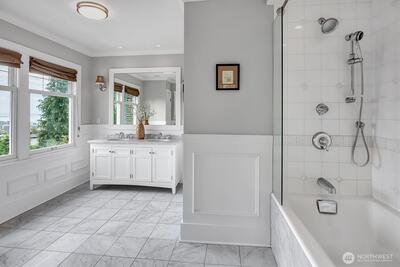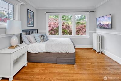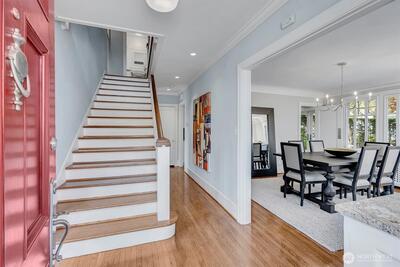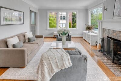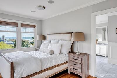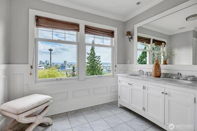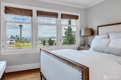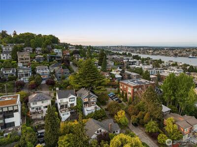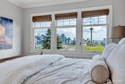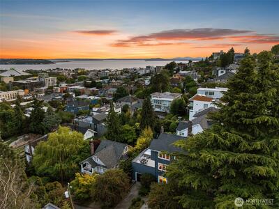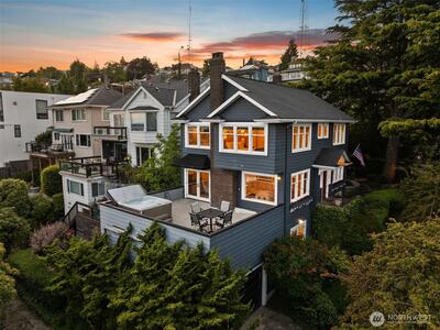 Stunning Queen Anne Colonial home located on the coveted South Slope with sweeping views of Seattle skyline and Puget Sound. The gourmet kitchen opens to a stone patio, while generous living spaces flow to a breathtaking view deck that is more than 450 sq/ft that includes a hot tub, ideal for entertaining. Upstairs features a primary suite with gorgeous views, ensuite bath, and two additional bedrooms. Lower level offers completely private Mother-in-law /guest suite with amazing kitchen and living area. Two car garage plus two additional off street parking. Incredible corner lot with gated outdoor space. Minutes to shopping, dining, schools and everything we love on Queen Anne. Less than 10min from downtown Seattle and South Lake Union. MUST SEE!!