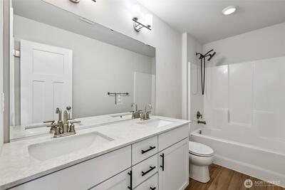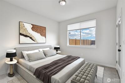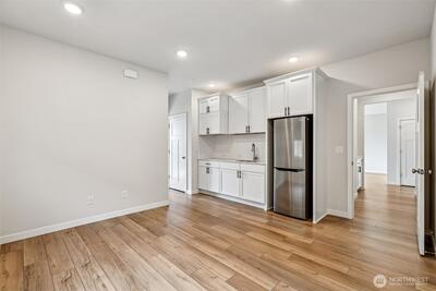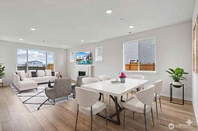Enjoy breathtaking views of Mount Rainier in this beautiful 2886 sq ft home and an elevated living experience where comfort, flexibility and stunning scenery come together. Experience the open-concept main floor, enhanced by new carpet, fresh interior paint, and thoughtful updates throughout. The spacious kitchen flows seamlessly into the living and dining areas—ideal for everyday living and entertaining. A standout feature is the private multi-generational suite on the main floor, complete with its own entrance, bedroom, kitchen, sitting area, bathroom, and in-unit washer and dryer—perfect for extended living or added versatility. The main floor also includes a dedicated office with wall-to-wall built-in shelving. Upstairs, a generous loft provides additional living space, while the large primary suite offers a relaxing retreat. Step outside to a freshly landscaped yard with six garden beds and a patio equipped with a natural gas hookup for grilling. Additional features include sm