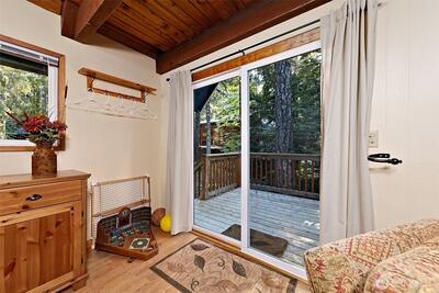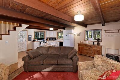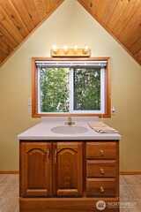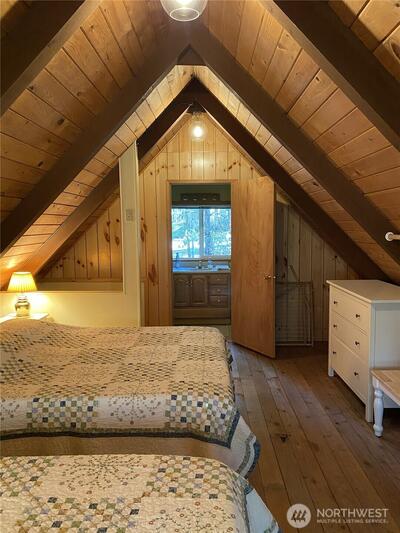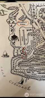 This property comes with an additional corner lot providing lots of space and privacy. Just steps away from Pioneer Village Division 1 Community Park-one of the nicest community parks on Lake Cushman with beach area, gazebo, restrooms, boat launch, dock, basketball court, volleyball court, and a playground area. Step into this PNW open concept cabin with ton and groove vaulted ceilings, laminate flooring, 3/4 bath, efficient kitchen, dining area and cozy living room with a free-standing woodstove. Sliding doors take you out to a large deck overlooking a greenbelt with a peekaboo view of the lake. Upstairs has a very large bedroom and 1/2 bath. Excellent opportunity to bring your dreams to fruition of waterfront fun without the waterfront taxes or for investment,full time, part time/recreational living.Every day is a vacation here!