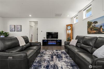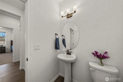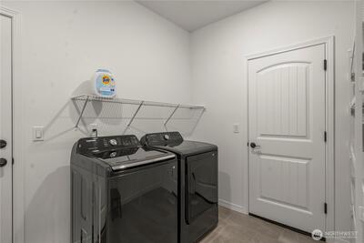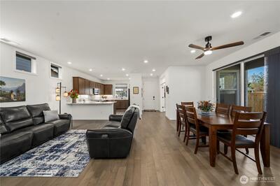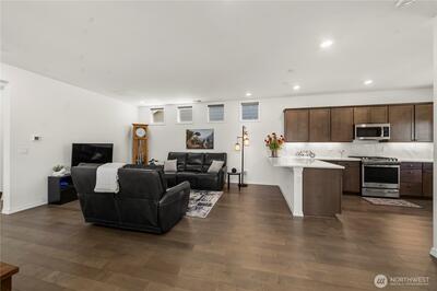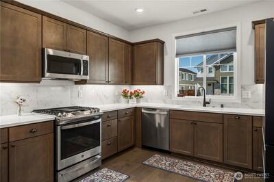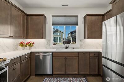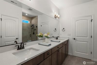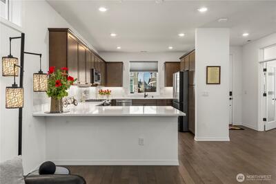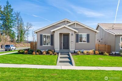 Resort 55+ living at Trilogy at Tehaleh! This better-than-new residence is ideally positioned on a premium corner lot with serene views of a protected natural preserve. Showcasing over $100,000 in Shea & owner upgrades, this home is a masterclass in 'Classic Chic' design. Beautiful, engineered hardwood flooring flows seamlessly throughout. The stunning kitchen features premium quartz counters, full-height backsplash, soft-close cabinetry, crown molding, & under-lighting. High-performance GE appliances are anchored by a Samsung Smart Refrigerator with Beverage Center, with the seating bar providing a natural social hub. The open-concept design offers a spacious great room and dining area. In addition to a convenient powder room, the primary suite is a true retreat with a private entrance to a spa-inspired ensuite featuring quartz counters, double sinks, a frameless glass shower & designer tile. The laundry/mudroom includes a Samsung washer & dryer with smart storage. And let’s n