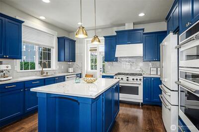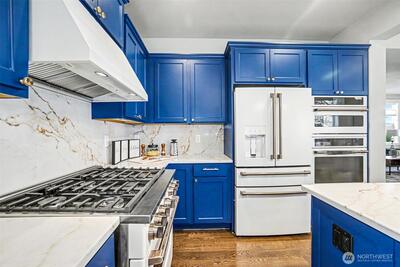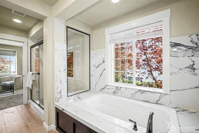This extensively remodeled home is located in the quiet Nettleton Commons neighborhood on a corner lot. The newly updated residence features an open main level with hardwood floors and plenty of natural light throughout. Kitchen includes quartz countertops and matching high-end Café appliances with two ovens. A major highlight is the large main suite, which includes an additional lounging area and a tranquil bathroom with a spa-like tub and walk-in shower. The property also includes an oversized two-car garage. The home offers good walkability, situated near Lake Washington and a short distance from downtown shopping and dining. This residence provides a balance of new updates and a convenient location in a peaceful setting.