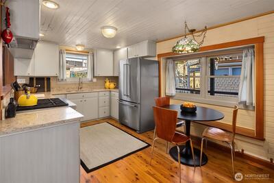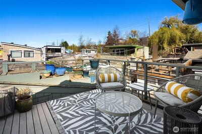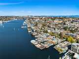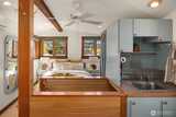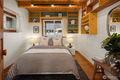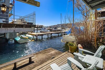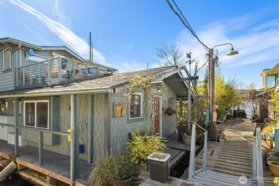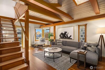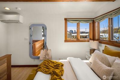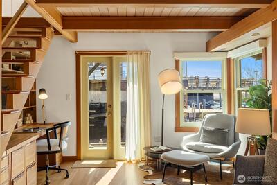 Two bed, 1 bath floating home - Space Needle views - Updated kitchen - Co-op owned community + float & moorage There are addresses in Seattle & then there are experiences. This Lake Union floating home, tucked into one of Eastlake's most beloved docks, is firmly in the second category. With the Space Needle framed in both bedroom & living room windows, the shimmer of Lake Union beneath your feet, life moves at a different pace. The home is a love letter to Pacific Northwest craftsmanship. Exposed Douglas fir beams, cedar plank walls, & rich hardwood floors run throughout. Hand-built details that surprise at every turn. Skylights draw in the famously dramatic Seattle sky. The updated kitchen punches above its weight: a professional-grade gas range, granite countertops, solid wood cabinetry, & a Tiffany style pendant casting jeweled light over the dining nook. French doors open to the deck — inside to outside feels effortless. A custom built-in desk beneath the staircase creates a