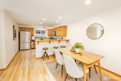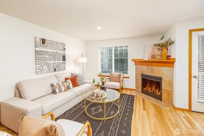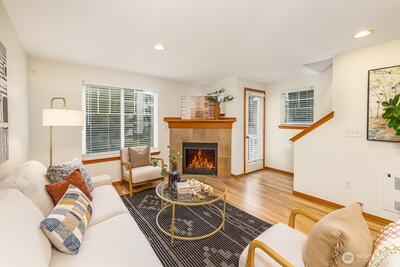 Welcome home to this charming Craftsman townhome ideally located. Just minutes from large, vibrant Virgil Flaim park, neighborhood cafés, an exciting lineup of restaurants, and the summer farmers market, this home offers the perfect balance of city access and peaceful living. Inside, you'll find a fresh, move-in-ready interior featuring newly refinished hardwood floors, brand-new carpet, and fresh interior paint throughout. The inviting living room boasts a lovely gas fireplace and bright windows that allow natural light, —perfect for relaxing evenings or entertaining guests. Step out onto the sweet balcony just off the living room for a breath of fresh air or your morning coffee. The kitchen is both stylish and functional, equipped with recently updated appliances and plenty of space for cooking and gathering. Downstairs, enjoy your own private patio—ideal for summer grilling, container gardening, or unwinding after a long day. Additional highlights include a single-car garage
