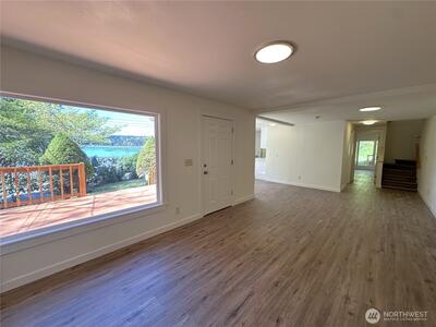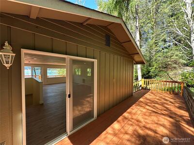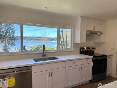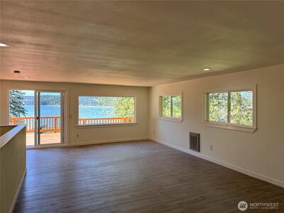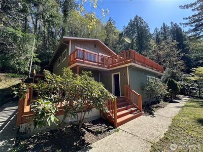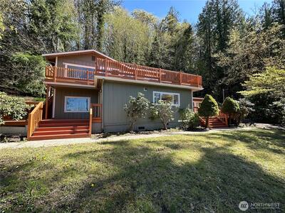 Beautifully remodeled 3-bedroom + office, 1.75-bath home set on 1.5 acres with sweeping views of Hood Canal and the Olympic Mountains from nearly every room. Perfectly situated along the scenic North Shore, this home combines peaceful waterfront views with convenient access to nearby amenities. Inside, the home features thoughtful updates and modern finishes throughout. A flexible office space is ideal for remote work or additional living needs, while the mud room adds practical functionality. The oversized primary suite occupies the entire second floor, creating a private retreat complete with an ensuite bathroom, walk-in closet, its own private deck, and stunning views from every window, even from the bathroom! Step outside to take in the stunning surroundings from four expansive decks, perfect for entertaining or simply relaxing while soaking in the views. The property also features a large driveway with ample parking, a spacious front yard, and a storage shed/outbuilding. Enjoy