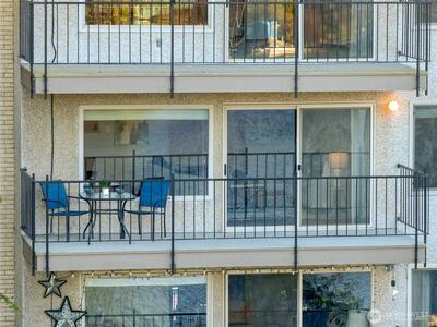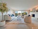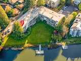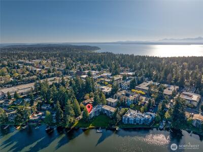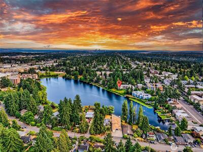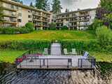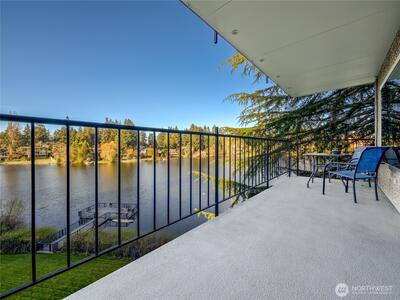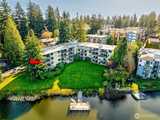 Experience waterfront living on Bitter Lake in this fully remodeled corner residence, where city noise fades and uninterrupted 180° lake and territorial views define every moment. Light and water shape a living backdrop from sunrise to sunset. Morning light pours through expansive windows, filling the home with calm. Afternoons offer quiet reflection over water and trees, while evenings glow with warmth as interior lighting contrasts the darkening lake, creating a private, restorative atmosphere. The 2-bedroom, 1.5-bath layout offers an efficient, open flow between living, dining, and kitchen areas. The updated kitchen features granite countertops, quality finishes, and functional design suited to daily living and entertaining. A wood-burning fireplace anchors the living room, adding warmth and texture against the view-driven setting. Step onto the covered private balcony for a fully immersive experience, fresh air, shifting light, and uninterrupted lake views. Bathrooms are tastef