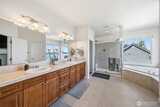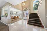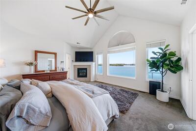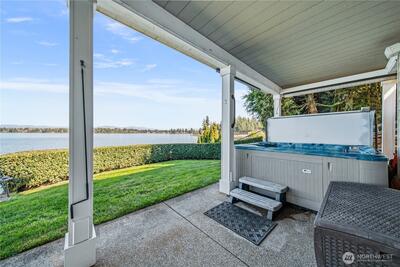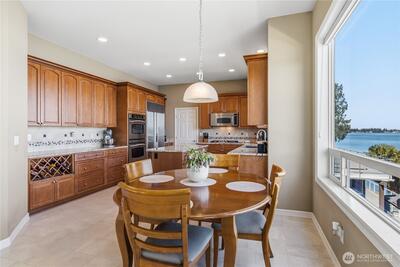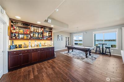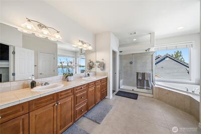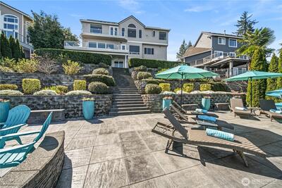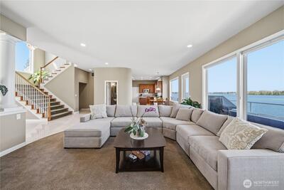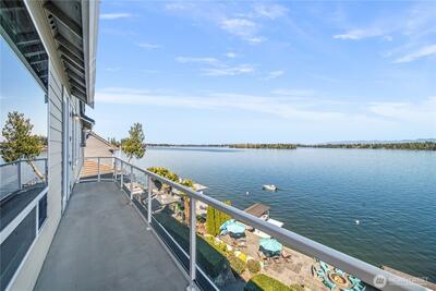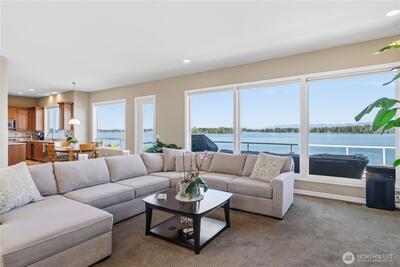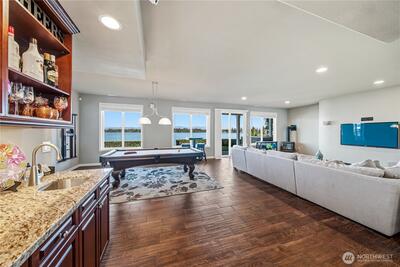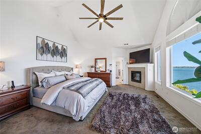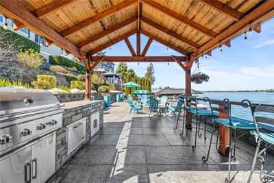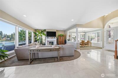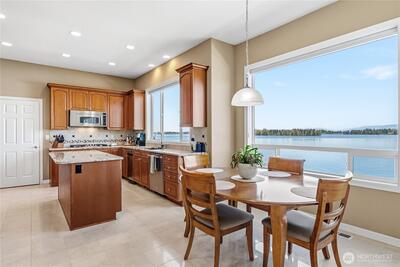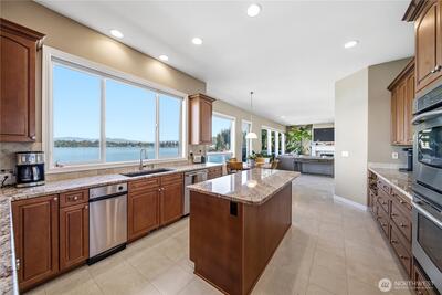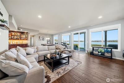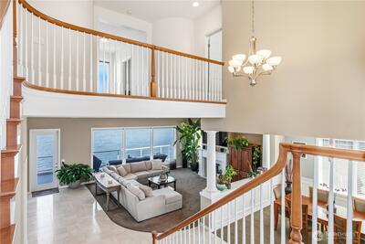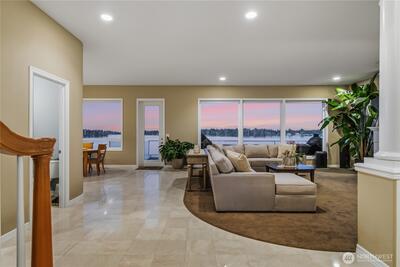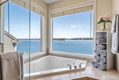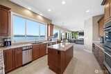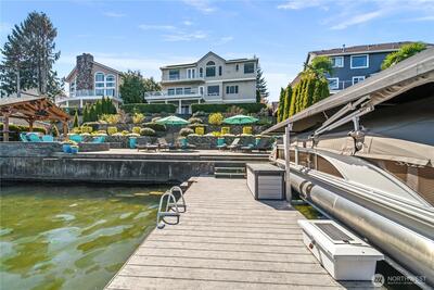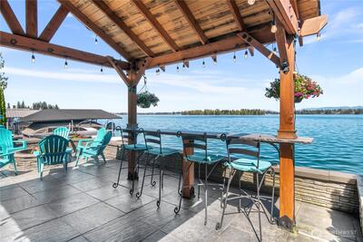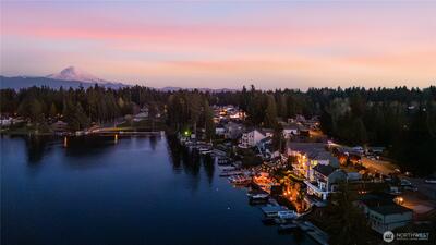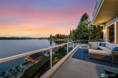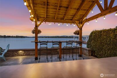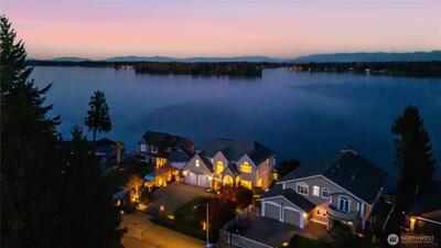 Commanding a premier open-water setting on Lake Tapps, this exceptional 4,360 sq ft custom residence captures sweeping panoramic views of the lake & the breathtaking Cascade Mountain range. Designed to embrace both luxury & lifestyle, the home showcases a timeless stucco exterior, tile roof, & a thoughtfully designed layout offering 3 bedrooms plus a private office, loft, rec room, & dedicated exercise room—providing flexibility for multi-generational living, entertaining, or working from home. Walls of windows frame the spectacular scenery, while the oversized great room & formal dining area create an impressive yet inviting atmosphere. The chef’s kitchen is beautifully appointed with marble flooring, upgraded cabinetry, a large island, & seamless flow to an expansive entertainment deck—perfect for hosting while enjoying the sweeping water & mountain views. The lakeside experience continues outdoors with a stunning patio featuring an island BBQ, gazebo, & professionally designed