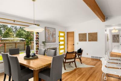 The trifecta: an exceptional location, design-forward mid-century modern style, and supremely functional layout that lives as beautifully as it looks. Tucked into a private, tree-lined setting on a serene ¼-acre lot, this spacious home offers the perfect blend of tranquility and convenience. Backing directly to the Seahurst Park greenbelt and just moments from Olde Town Burien’s restaurants, cafés, & the waterfront, the location is as special as the home itself. Light-filled & thoughtfully updated, this home offers multiple living spaces with flexibility for both entertaining and day-to-day life. Refinished hardwoods add warmth throughout, while an integrated smart home system & high-efficiency EV charger bring modern ease to everyday living. Recent improvements include new plumbing, upgraded electrical, two beautifully renovated bathrooms, new basement windows, and solid core interior doors-with additional updates enhancing the home throughout. The expansive composite deck i