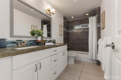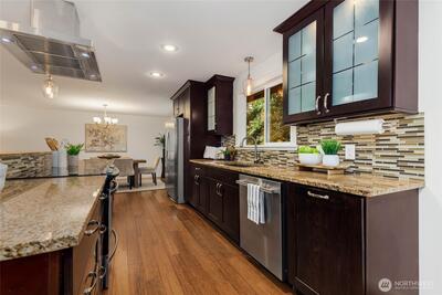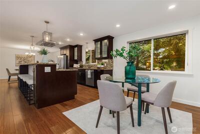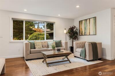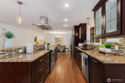 Nestled on a quiet, tree-lined street, this beautifully remodeled home offers comfort and convenience. Located in the highly sought-after Northshore School District, just over a mile from Lockwood Elementary and Kenmore Middle School, the setting blends suburban tranquility with everyday convenience and accessibility. Enjoy a super spacious, open-concept layout ideal for modern living. Thoughtfully designed for both livability and function, the home includes abundant storage, large living areas, and room for everyone to spread out. The expansive kitchen is a true centerpiece for gatherings, complete with slab granite counters, stainless steel appliances, and casual dining space. Rich hardwood floors are complemented by fresh interior paint. Other recent improvements include new carpet, and rebuilt back deck, perfect for relaxing or entertaining. Stay comfortable year-round with a heat pump for efficient heating and cooling, plus a furnace backup. A French drain ensures the fully-finish