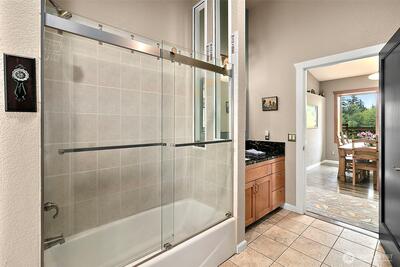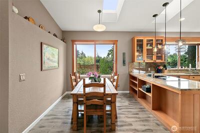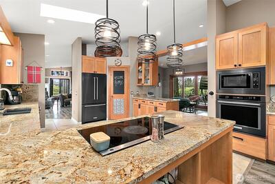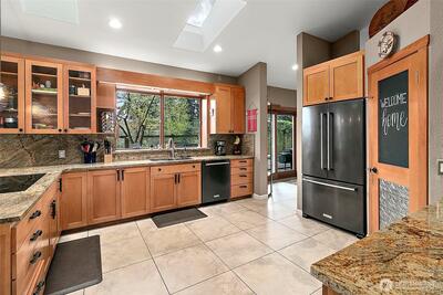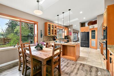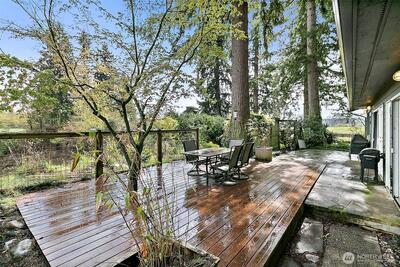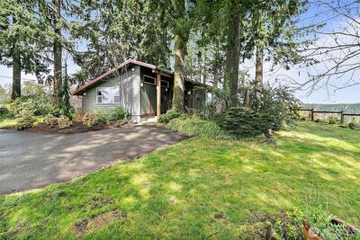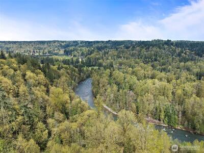 Private Enumclaw retreat on just shy of an acre with river and territorial views! This 3-bed, 2-bath home offers 2,310 sq ft with an open-concept layout, abundant natural light, and great indoor/outdoor flow. Spacious kitchen features warm wood cabinetry and opens to the main living area, ideal for entertaining. Bedrooms are generously sized, offering comfort and flexibility. The ensuite primary bath is well-equipped for everyday ease. Enjoy two patios overlooking a peaceful, secluded setting. The detached garage offers excellent potential for a DADU or mother-in-law suite. Plenty of usable land with room to garden, play, or expand. Quiet, private feel while still convenient to town amenities.