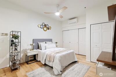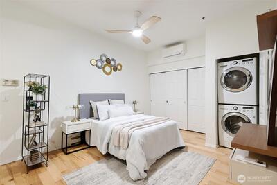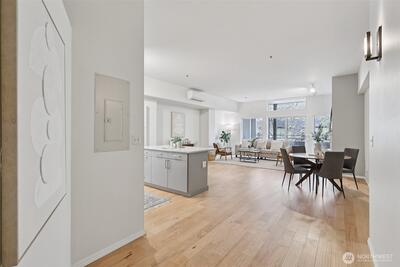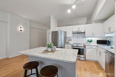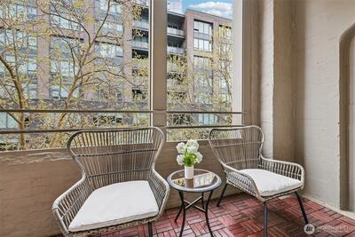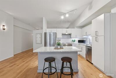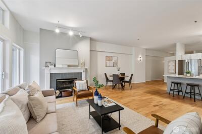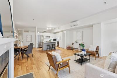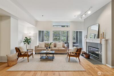 The location that WOWS - this 2 bedroom, 1.5 bathroom updated home has it all! Central air, updated fans and lighting all in 2025 (over $30,000 spent). A chef's kitchen featuring Cambria Quartz countertops, stainless steel appliances (induction range!) with an open floor plan and 10ft windows near Lumen Field, T-Mobile Stadium, Pioneer Square restaurants, transit and more. Relax on your private East facing balcony, or near the woodburning fireplace. The pet-friendly building has a strong HOA. The second bedroom can flex as a workspace. The unit includes full-size, stacked washer and dryer. 96-walk score, 96-bike score and transit score-100! Outstanding location to enjoy everything Seattle! Make this your home today!