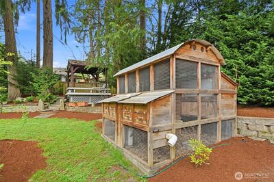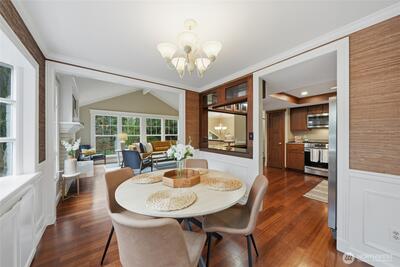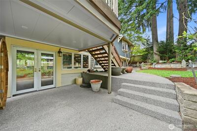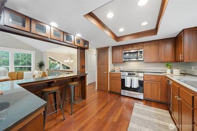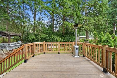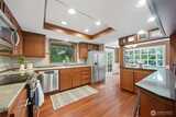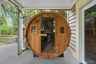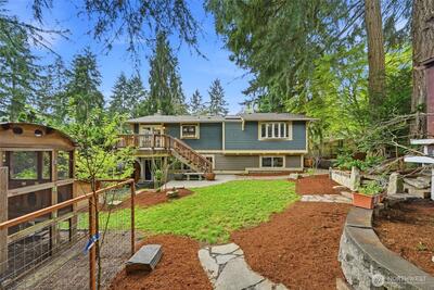 Charming Education Hill split-level in the heart of Redmond, rich with character, warmth, and timeless craftsmanship throughout. The inviting kitchen features granite countertops, stainless steel appliances, convection oven and a newly installed oversized sink with thoughtful pass-throughs to the dining and living areas. The result is a bright, connected feel that still maintains defined spaces. Upstairs showcases gorgeous hardwood floors and detailed millwork, including crown molding and chair rails, adding timeless appeal. Recent updates include new attic insulation (2019), heat pump with A/C (2021), new water heater (2026), and fresh interior paint throughout (2026). Step outside to a private backyard retreat with raised garden beds and mature fruit trees, including fig, apple, and plum. Multiple outdoor living spaces — from the detached covered pavilion to the outdoor sauna (2025) — perfect for year-round Pacific Northwest entertaining. The yard also features a thoughtful