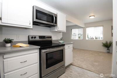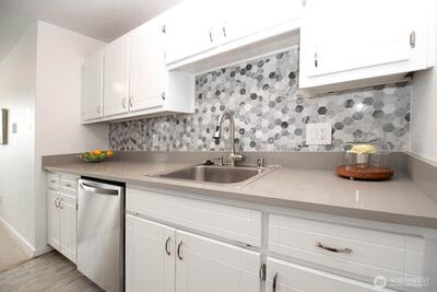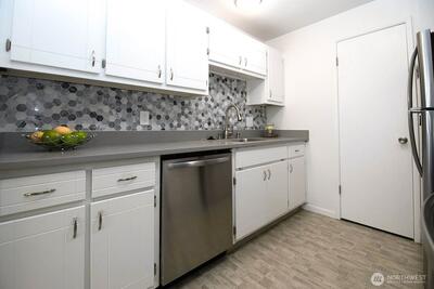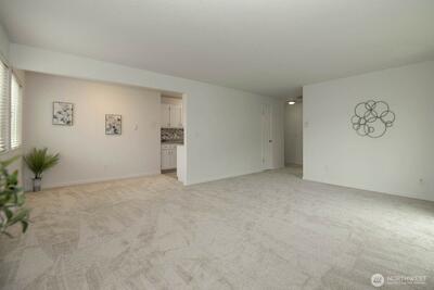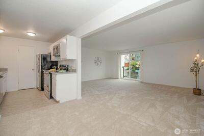 In a highly sought-after Greenwood spot, this spacious and well-kept 1-bedroom end unit is close to all the best of Greenwood and North Seattle. Fresh paint and brand-new carpet give it a clean, updated feel, while big windows flood the space with natural light. The oversized bedroom offers plenty of room plus a large 3-door closet. The kitchen features quartz counters, stainless steel appliances, and a stylish backsplash. Community parking is conveniently located at the back, with a private, easy-access entrance. On a major bus line, you’ll have quick access to Downtown, Ballard, Green Lake, Carkeek Park, and charming nearby coffee shops and pubs, with Trader Joe’s and Fred Meyer just a short walk away. This home and community are ready to win your heart!