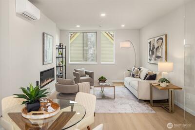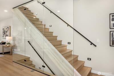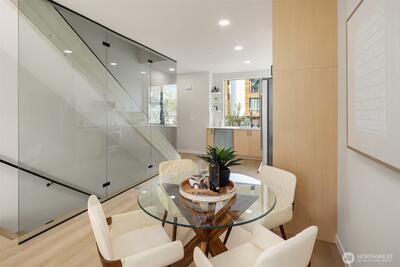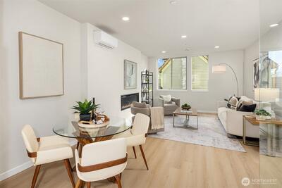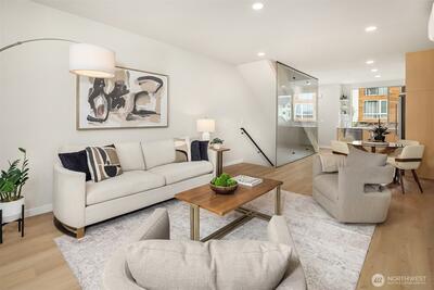 Welcome to Soundview, a boutique collection of modern townhomes by Greencity, designed for those who seek sophistication & urban convenience. Welcome to Residence 1153 where you will enjoy a first-floor spacious entry/drop zone, full bathroom and large bedroom with access to a fully fenced back patio. Wander up to the main floor to a well-designed kitchen, full of natural light, which opens to the dining and cozy living room with a fireplace. Two spacious bedrooms with large windows, great storage, laundry and a full bath are next with a stunning primary suite complete with vaulted ceilings, custom nightstand lights and a well-appointed attached bath on the top floor. Don't miss the private rooftop deck, perfect for relaxing after a long day. Nestled in the heart of Ballard, this community offers the perfect balance of city energy & serene parks nearby. Flexible floor plans adjust to your lifestyle. Live moments from the shops, entertainment & recreation of Ballard! Off-street, assigne