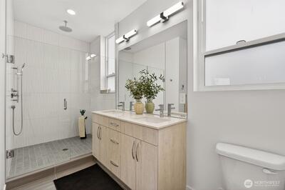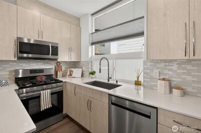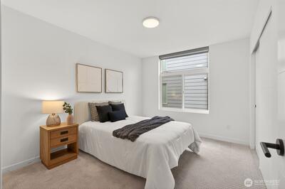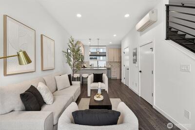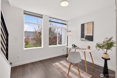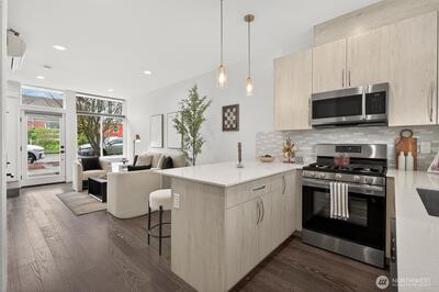 Experience the perfect blend of modern design and urban functionality in this 2021-built Ballard townhome. The light-filled main floor welcomes you with an open-concept living area and a chef's kitchen featuring an oversized island with breakfast bar seating, gas cooking, and stainless steel appliances. On the second floor, find a spacious guest bedroom, a full bath, and a dedicated den or flex space ideal for a home office, hobby room, library, or quiet retreat. The entire third level serves as a private primary suite with a spa-inspired 3/4 bath and direct access to the home's crown jewel: an expansive rooftop terrace perfect for entertaining or unwinding while soaking in the Seattle views. Completing the package: a designated off-street parking space and a prime Ballard location just blocks from the restaurants, coffee shops, and boutiques that define the neighborhood's signature lifestyle. No HOA.