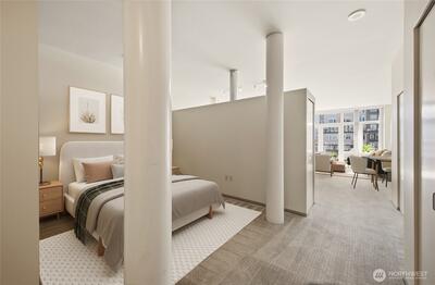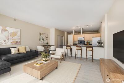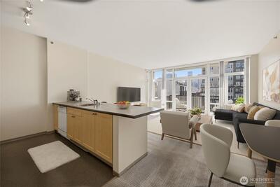 Enjoy city living at its finest in this light-filled 1-bedroom condo at the Klee Lofts! This south facing urban retreat offers captivating views of Puget Sound & the Seattle skyline. Kitchen with breakfast bar opens to the spacious living room and Floor-to-ceiling windows. Well appointed bath, 3 convenient closets, in-unit laundry, a private balcony perched over the city. One car parking space in a secure garage and storage unit included. Enjoy community terraced garden, BBQs, concierge, security, club room & gym. Residents of this pet-friendly building benefit from robust HOA, immediate access to Pike Place Market, Waterfront, Olympic Sculpture Park dining & more. Walk Score of 95! Great for Owner Occupy or Rental Investment, Solid rental history report available. No Rental Cap.