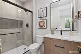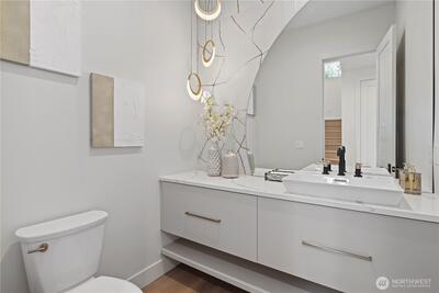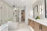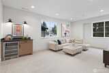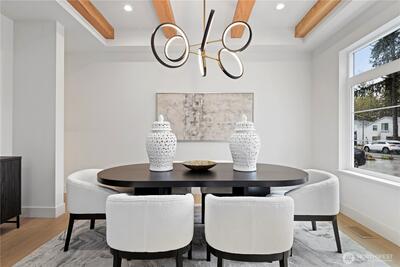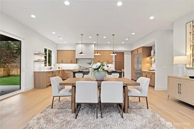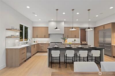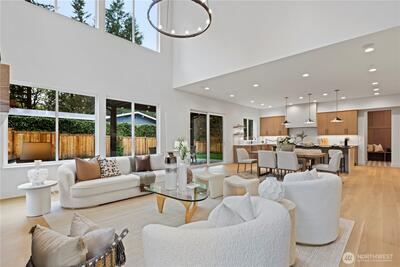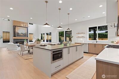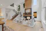 Hamish Anderson Custom Homes, known for Architectural Digest–worthy estates, offers a special limited-edition showcase home. This design-forward NW Contemporary blends warmth, abundant light and sophistication on an oversized, level cul-de-sac lot. Soaring windows surround the home’s central gathering space, where a light-filled great room is anchored by a dramatic two-story gas fireplace clad in large-format stone with organic gold veining and refined slat panel detailing. Chef-caliber kitchen with Thermador appliance suite: French door refrigerator with four freezer drawers and a 48" pro-grade Wi-Fi-enabled gas range with double ovens. Oversized island topped with leathered quartz and seating for four. Generous informal dining for everyday living, plus formal dining with exposed wood beams and a niche for an heirloom piece. Oversized primary with chandelier, millwork accent wall and sleek ensuite with LED backlit mirrors, tile feature wall, motion lighting, freestanding soaking t