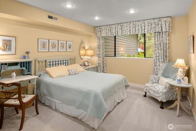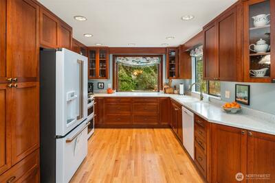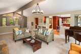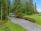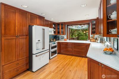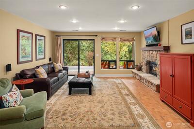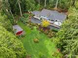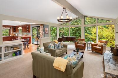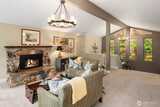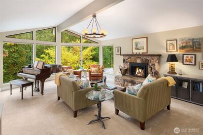 Set on over two acres of lush, private grounds, this coveted daylight rambler offers thoughtfully designed living spaces that blend comfort, function and recent updates. Inside, you will find a spacious living room with a vaulted ceiling and walls of windows that flood the home with light. The remodeled kitchen connects the living and dining rooms, creating a natural gathering space. It features premium Café appliances, including a double oven and gas range, complemented by Corian countertops and custom cabinets. A slider takes you to a view deck, creating seamless indoor-outdoor living. The home has four bedrooms plus a versatile fifth guest room with a closet and built-ins, perfect for visitors or a home office. 3 beautifully renovated bathrooms add a fresh, modern feel. The lower level features a spacious bonus room with a second fireplace & wine cellar, the perfect place to unwind. Recent upgrades include a new roof & furnace, providing comfort and peace of mind. Step outside t