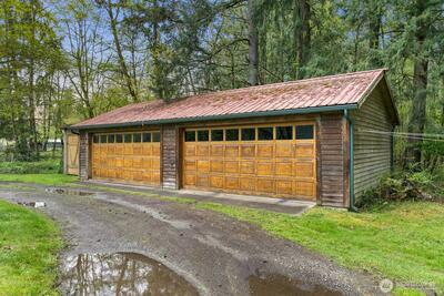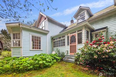 Set on a storybook parcel surrounded by evergreens, this timeless farmhouse offers a rare blend of character, scale, and opportunity. A wide, welcoming porch and classic architecture create an immediate sense of arrival, while expansive grounds invite a lifestyle rooted in privacy and connection to nature. Inside, original hardwood floors, vintage millwork, and generous living spaces reflect enduring craftsmanship. Sunlight fills the home through large windows, creating a warm and inviting atmosphere. Distinctive architectural details and flexible living areas offer both charm and versatility for modern living. The kitchen maintains its classic appeal with solid surfaces, statement range, and easy connection to gathering spaces—ready to enjoy or reimagine. Upstairs, spacious rooms and unique layouts provide options for a variety of lifestyles or future updates. Outdoors, the property opens to usable land with multiple outbuildings, including a large detached garage/shop and additi