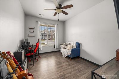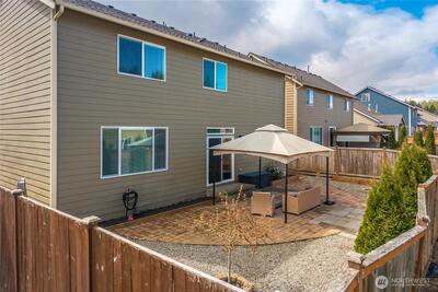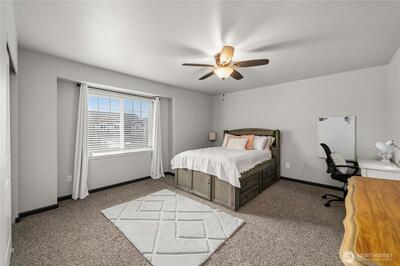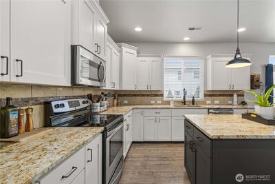 With over 2,400 square feet, this home is built around the kind of open, connected living space that makes everyday life feel effortless. The kitchen is the centerpiece — a large island, granite countertops, and an oversized walk-in pantry anchor the space, flowing naturally into the dining and living areas. Whether you're hosting a crowd or enjoying a quiet evening in, the layout keeps everyone connected. A dedicated office just off the entry offers a quiet space for working from home or everyday flex use. Upstairs, four generously sized bedrooms provide plenty of room for the whole household. The primary suite features vaulted ceilings, a deep soaking tub, a large walk-in closet, and an en suite bathroom with dual sinks. A second full bathroom with dual sinks serves the remaining bedrooms with ease. Outside, a fully fenced backyard offers room to spread out — whether you're entertaining guests, letting the pets roam, or simply enjoying the outdoors at the end of the day. Minutes