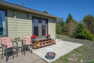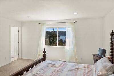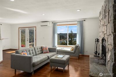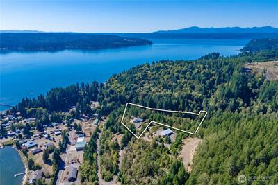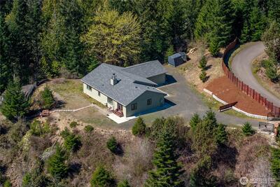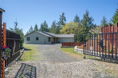 Private 3.8 acre gated retreat with sweeping Hood Canal and peninsula views, perfectly positioned to capture beautiful sunrises and glowing sunsets. With a south and west-facing orientation, the home is filled with natural light throughout the day, and the views are front and center from the living room and primary bedroom. The home and grounds have been thoughtfully maintained and truly cherished. Enjoy the quiet of nature—chipmunks, deer, eagles, and songbirds are regular visitors—right from your own yard. Inside, you’ll find Pergo hardwood floors, granite counters, quality cabinetry, and thoughtful modern systems including a mini-split for heating/cooling, Quadra wood burning fireplace, reverse osmosis water, heat recovery ventilator air system, crawl-space ventilation, and a tankless water heater. The exterior has been freshly painted. The covered carport also functions nicely as a dog kennel, and there is a usable flat area on the property with potential for an ADU or future