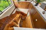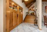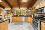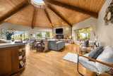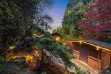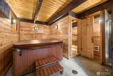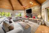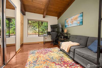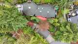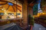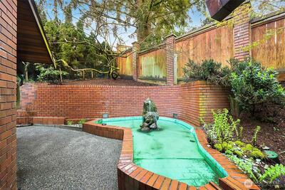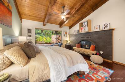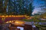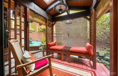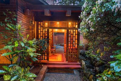 Tucked behind a private gate, this one-of-a-kind Lake Forest Park gem offers a rare blend of natural beauty and thoughtful design. Meandering pathways, a flowing stream, and Japanese-inspired grounds create a tranquil setting with sweeping Cascade and territorial views. At the heart of the home is a pavilion-style living room with soaring wood-beamed ceilings and a dramatic central skylight, filling the space with natural light. Anchored by a stone fireplace and surrounded by windows, it creates a seamless indoor-outdoor connection. The primary suite is set apart with its own outdoor covered sitting area, where you can unwind to the gentle sound of the nearby fountain and stream. The outdoor experience shines with terraced decks, two BBQ areas, and a detached bathhouse with sauna, hot tub, and shower. A custom-built treehouse offers a unique place to take in the views, perfect for morning coffee or a quiet escape. The fully fenced grounds are professionally landscaped with irrigation,