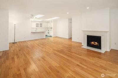 EASY-LIVING LUXURY ~ Tucked away on a quiet cul-de-sac with serene evergreen views in Puyallup's premier 55+ gated community, Willow Gardens, this 1,520sf move-in ready rambler is where the comforts of a single-family home meets the convenience of a low-maintenance condo! Gorgeous curb appeal with covered entry, manicured gardens & brick accents. Clean & pristine, the open concept floor plan features fresh paint & upscale hardwood floors throughout. Welcoming foyer opens to grand living room with upgraded gas fireplace & slider to covered deck. Generous open kitchen with peninsula breakfast bar features soaring skylights flowing into the light-filled dining space. Primary bedroom features recessed lighting, walk-in closet & ensuite with full-size shower & sprawling dual-sink vanity. Guest bedroom + den/office & full bath with tile floors. Large utility room with cabinetry opens to double garage with storage. Efficient new heat pump/central A/C. Low HOA dues include water/sewer & lawn