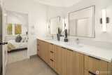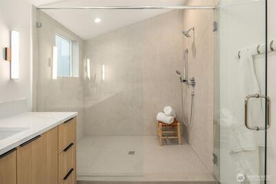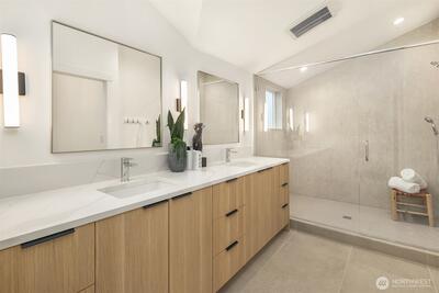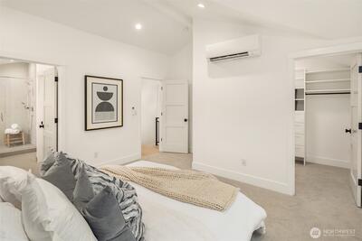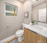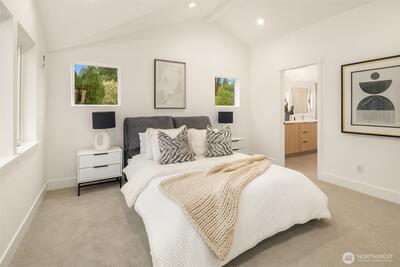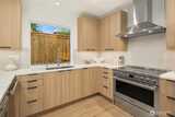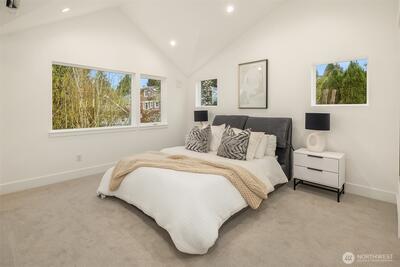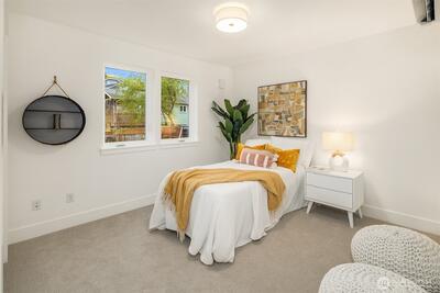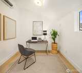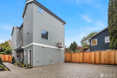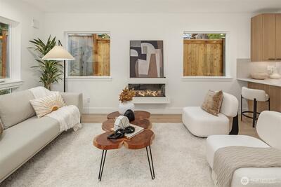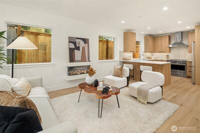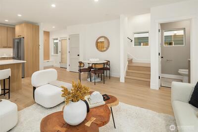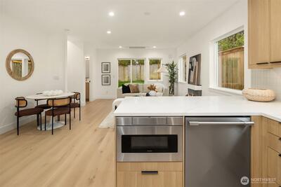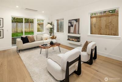 Just a short stroll to Green Lake. This thoughtfully designed home by Moderna Homes is ideally located just blocks from Greenlake Park and Greenwood Avenue, offering easy access to the 2.8 mile walking loop, open green space, and year round recreation. Neighborhood favorites like Red Mill Burgers, El Chupacabra, and Petit Pierre Bakery are all just moments away. The home spans three well designed levels, featuring a private top floor primary suite with a spacious office, perfect for working from home or a quiet retreat. The second level includes two additional bedrooms and a full bath, providing flexibility for guests, roommates, or additional workspace. The main level is centered around the kitchen, living, and dining areas, and opens to a large fenced backyard ideal for everyday living and entertaining. Just inside the entry, built in storage creates a functional and polished space for daily essentials. The chef’s kitchen is equipped with high end appliances, quartz countertops, an